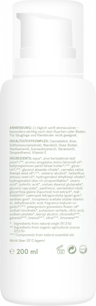 A Bodylotion plus-ban a CBD-t számos egyéb nyugtató és ápoló összetevő egészíti ki. A kendermagolajban található gamma-linolénsavat a gyulladások enyhítésére és az irritált vagy viszkető bőr csillapítására is használják. A kendermag- és mandulaolajban, a sheavajban és a napraforgóolajban található telítetlen zsírsavak támogatják a bőr természetes védőrétegének regenerálódását, és hosszú távú hidratálást és természetes lipideket biztosítanak a bőrnek. Az aloe vera és a dexpanthenol is ápolják és védik a bőrt. A hatást az antioxidáns E-vitamin teszi teljessé, amely védi a bőrt az idő előtti öregedéstől és megőrzi rugalmasságát.